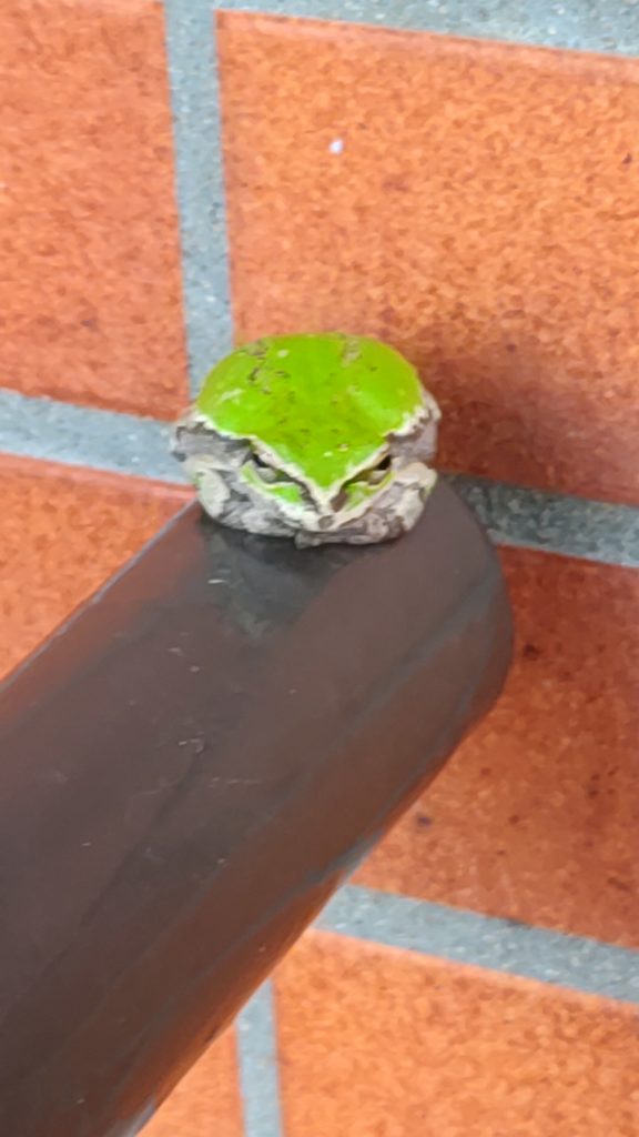 このかえる、7Fの手すりにいた。どこからきたのか・・・わからない。下の1Fから登っってきたのか、もしそうだとしたら大変な苦労をして登ってきたのだ。虫などのえさを求めてきたのか、ここはえさらしきものもないもないし、まあ、蛾ぐらいはとんでくるが、それにしてはそんなに苦労しなくてもという次第で、それにここはカラスが多いので自身が食べられてしまう危険がある。いつも、カアカアないてでっかい奴、しかもこいつは、階段や手すりに留まっていつもおしっこやウンチをしている。よくみかける白っぽいやつはからすの小便である。こいつが始末が悪い。ほったらかしにしていると、化学変化をきたして非常に除去しにくくなる。困ったものだ。