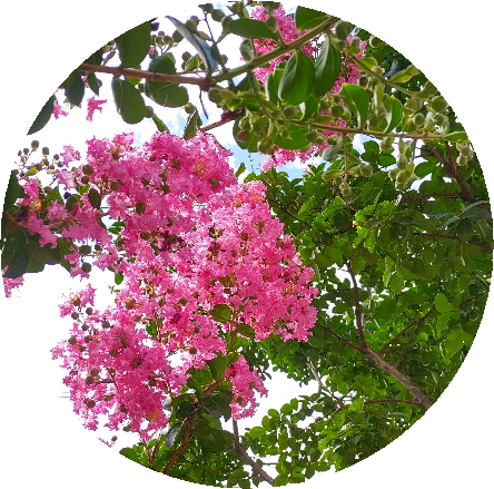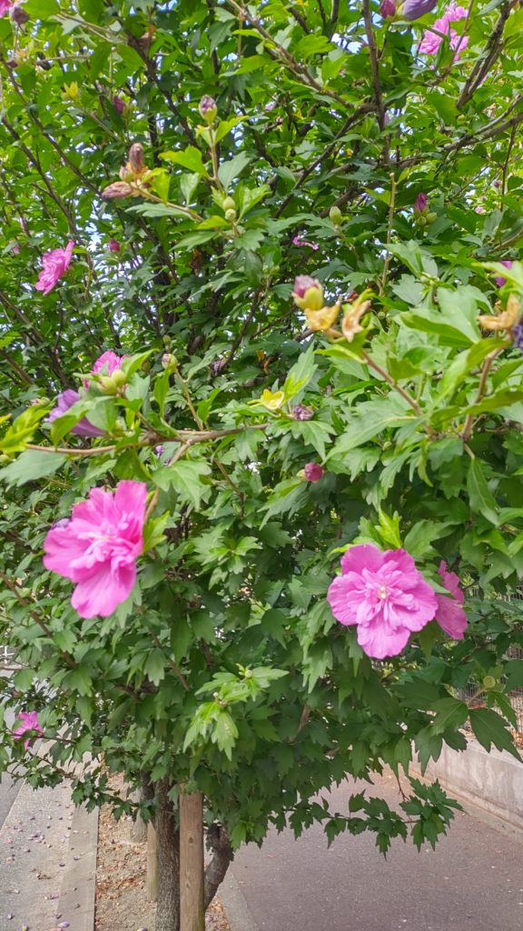 暑い夏が来ると俄然元気に咲き誇るのが、さるすべりとムクゲ。さるすべりは小さな花が塊になってどんとさくピンク色の花がかわいい。ムクゲは次から次へと絶え間なく咲くので華やかであるが、コンクリートの道路側に散るとべったりくっついてちょっと始末に厄介である。